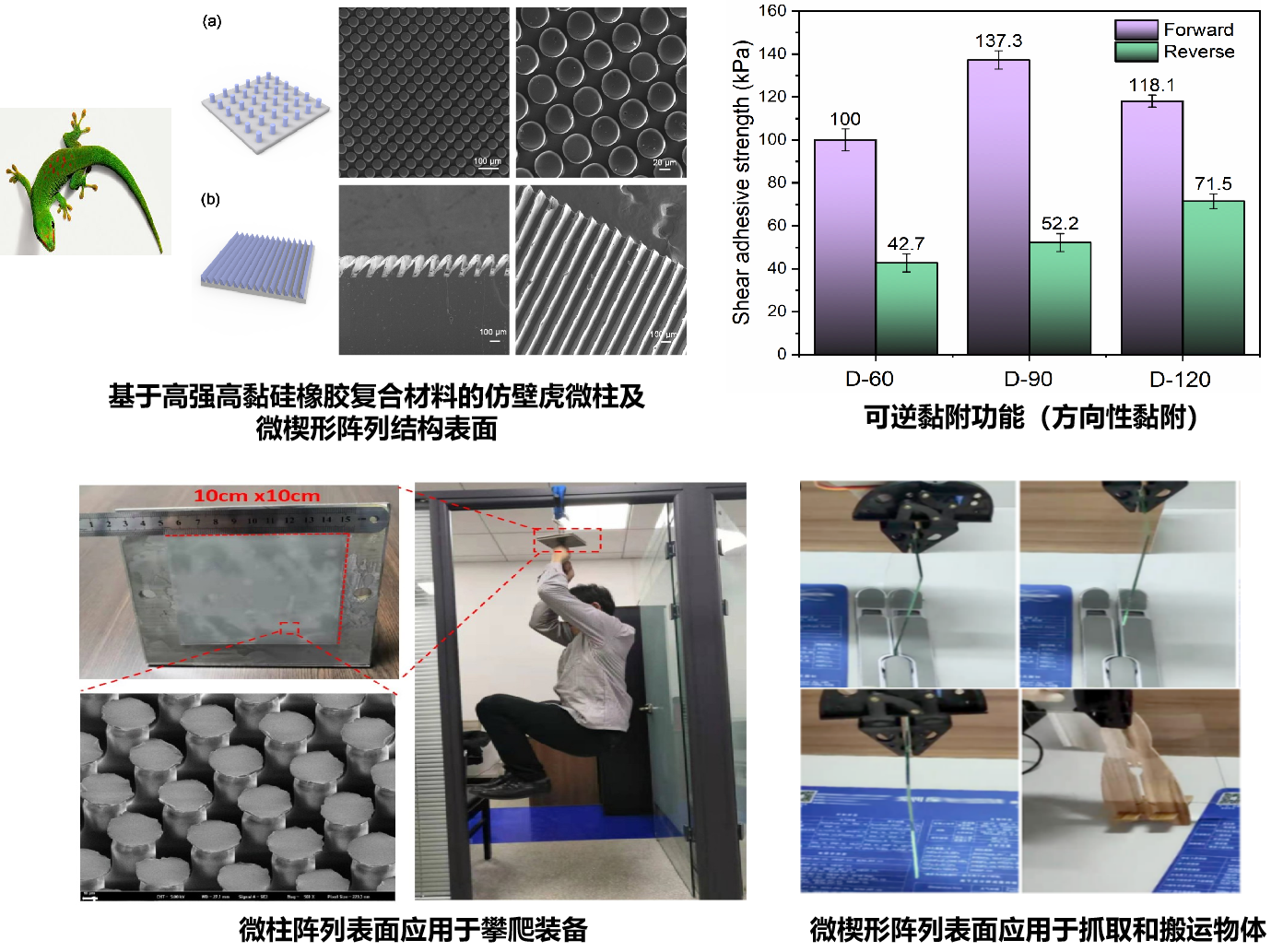 科研推动发展,北理工先进结构技术研究院深入开展学习贯彻习近平新时代中国特色社会主义思想主题教育(之二)——结构院科研团队在壁虎手套材料与表面的设计与制备上取得进展为深入开展学习贯彻习近平新时代中国特色社会主义思想主题教育,先进结构技术研究院积极开展有组织科研,全面推动研究院教育科研事业高质量发展。近期,研究院科研团队在壁虎手套材料与表面的设计与制备上取得了进展。 传统的攀爬工具,如绳索、爬梯等,具有重量大、携带不便、机动性差、攀爬路线不可改变等缺点。而从壁虎的运动获得启发,仿生制造可穿戴、具有超强攀爬能力的壁虎手套,实现成人在竖直墙壁上的快速灵活运动,在单兵作战、野外勘探、救灾抢险等领域具有重要的应用前景。 壁虎手套的工作原理是在其表面构筑与壁虎脚掌刚毛组织相似的微观结构,使得手套表面具有类似壁虎的超强黏附能力。目前壁虎手套的设计和制造仍然受到材料性能的严重制约,常用的硅橡胶等高分子柔性聚合物强度较低,所制造的仿壁虎黏附表面易发生破坏,难以承受成人体重;同时材料表面能也较低,导致仿壁虎表面的黏附性能难以有效提高。如何通过材料与结构综合设计,制备承载-黏附可控一体化的功能表面,仍是壁虎手套研究中亟待解决的关键科学问题。 近年来,先进结构技术研究院陈少华教授课题组针对壁虎手套材料与表面的设计和制备开展了系统研究。首先,针对壁虎手套基材的承载需...2023.05.09 -