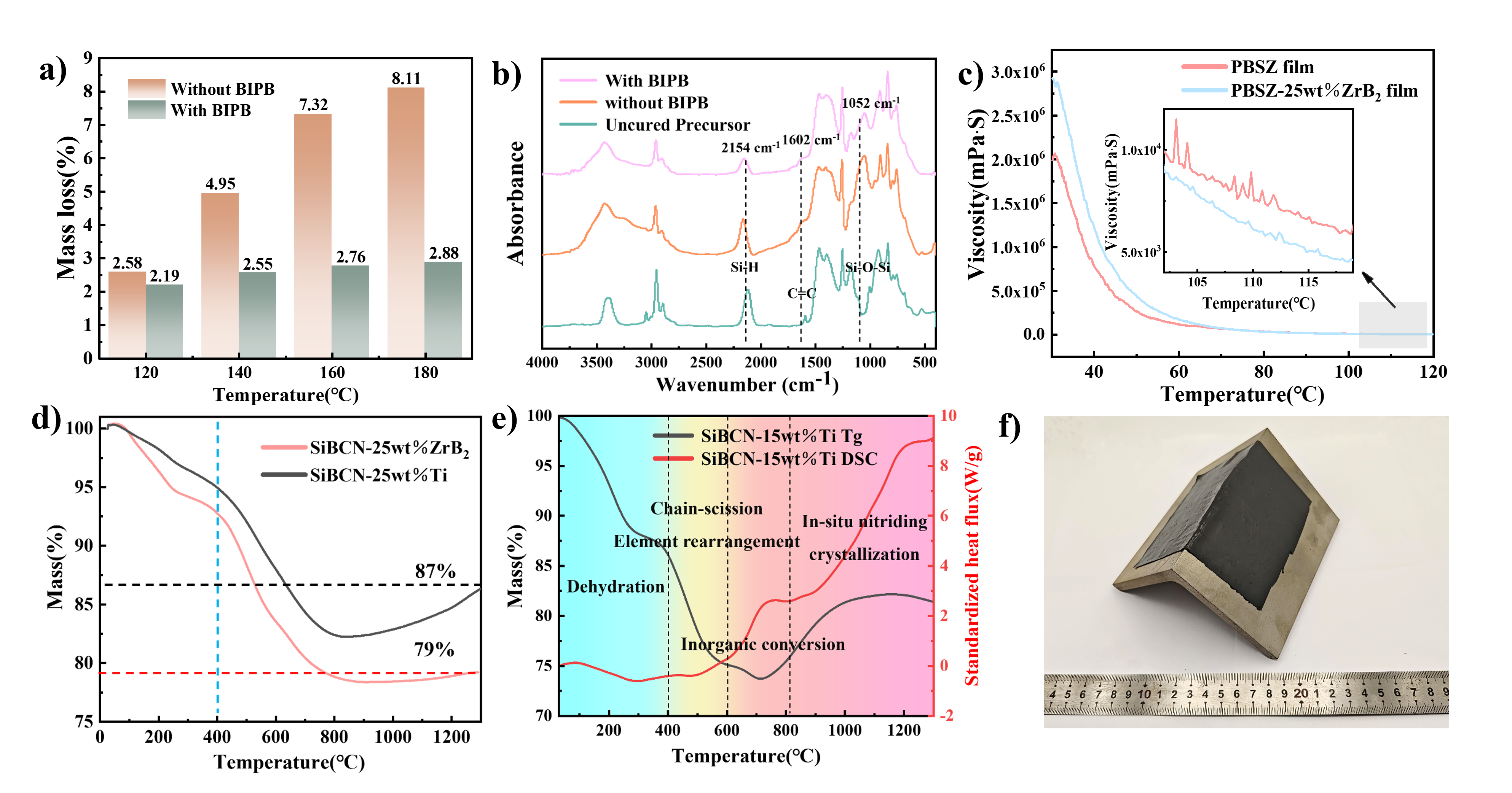 图3.前驱体的理化性质:(a)不同温度处理下的挥发份含量;(b)新型前驱体红外光谱;(c)填料改性前驱体的粘度-温度曲线;(d)SiBCN-25wt% ZrB2与SiBCN-25wt% Ti的热重曲线;(e)SiBCN-15wt% Ti的TG-DSC曲线;(f)具有良好变形性的SiBCN-M体系。