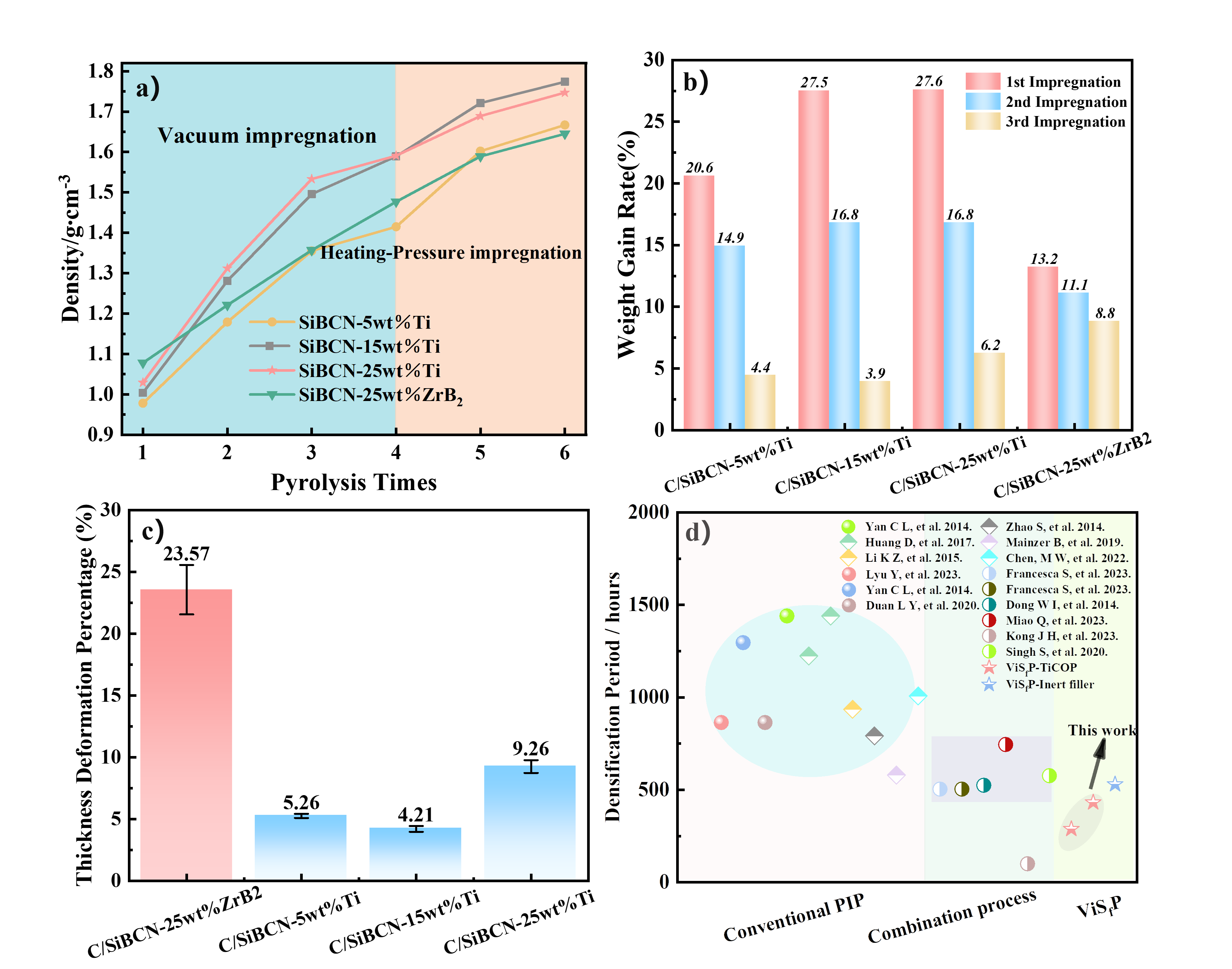 bevictor伟德张中伟教授团队开发了一种具有原位自增密的陶瓷基复合材料快速制备技术,旨在实现材料的高效、高通量、低成本制备。开发了无机填料改性的新型高粘聚硅硼氮烷前驱体,具备低挥发份、高陶瓷产率和填料稳定负载特性;创新性提出活性金属作为气相固碳/固氮引发剂,实现C/SiBCN复合材料的快速致密化,这种技术被命名为ViSfP-TiCOP。该工艺方法对缩短陶瓷基复合材料制备周期、提高前驱体利用效率、并降低材料制备成本具有非常重要意义和经济价值,为进一步扩大陶瓷基复合材料的应用领域提供了全新的思路和策略。相关研究成果发表于复合材料Top期刊《Composites Part B: Engineering》,论文标题为“A novel rapid fabrication method and in-situ densification mechanism for ceramic matrix composite”(10.1016/j.compositesb.2024.111881)。