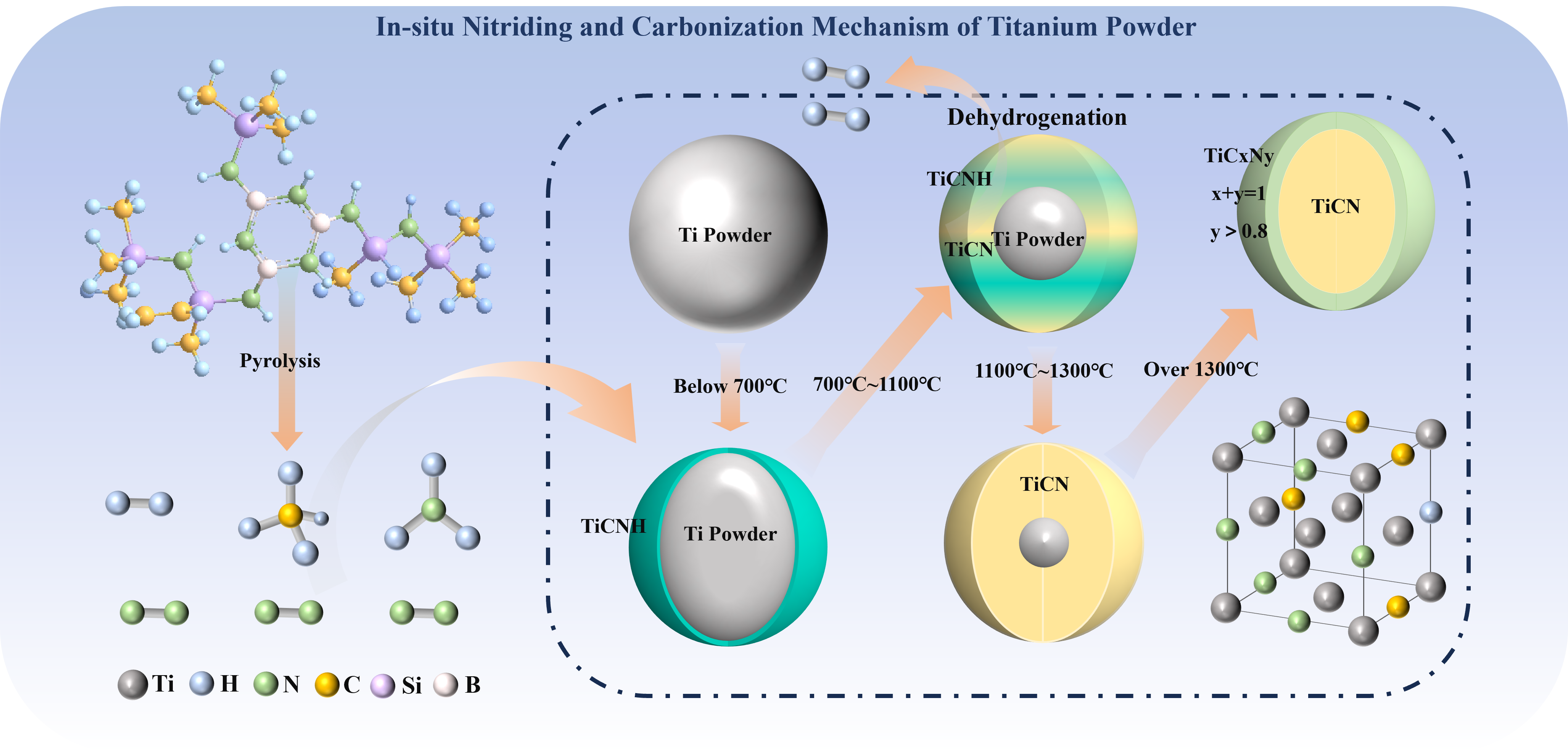 研究发现,在1500℃高温裂解过程中,Ti的原位气相氮化与碳化机理能为CMCs的快速致密化提供“额外”的增重与体积膨胀,见图6。SiBCN前驱体裂解生成以CH4、NH3、H2为代表的小分子气体,700℃以下时这部分气体便溶解于Ti中且开始反应生成TiCN(H);在700~1100℃时,TiCN(H)开始发生脱氢反应并生成TiCN;在1100~1300℃时,完全转化为TiCN,这种固溶体的晶体结构是典型的面心立方结构。不仅如此,当继续升温时,N2不再成为“稳定的”惰性气体,开始与残余的Ti反应生成TiN(C)。上述气相自增密机制极大促进了CMCs致密化进程,实现有限次数快速制备。