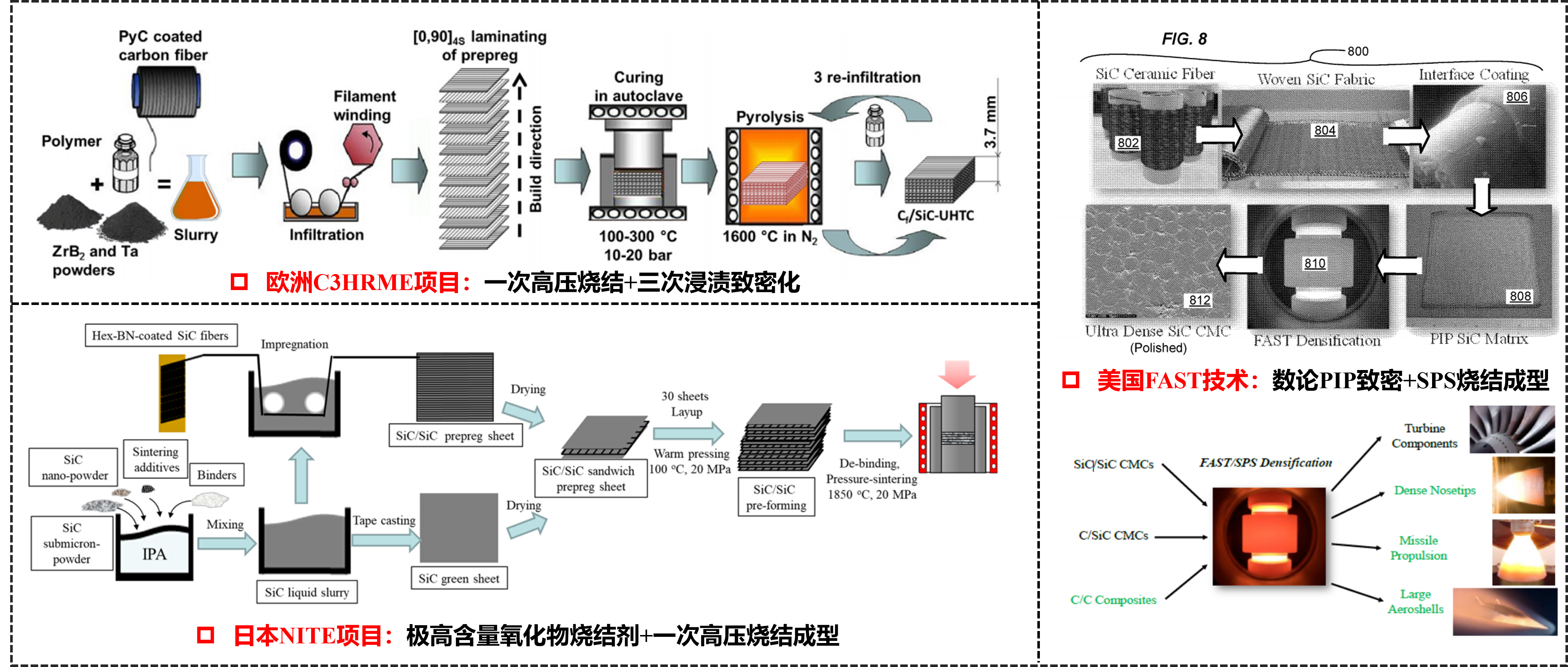 快速成型工艺方法一直是陶瓷基复合材料重点研究方向。例如,欧洲C3HRME项目、日本NITE技术以及美国MATECH的FAST技术。然而,上述快速制备工艺均使用了高温高压的烧结技术,这类烧结技术不仅依赖高昂的工艺设备,而且制备异形构件非常困难。