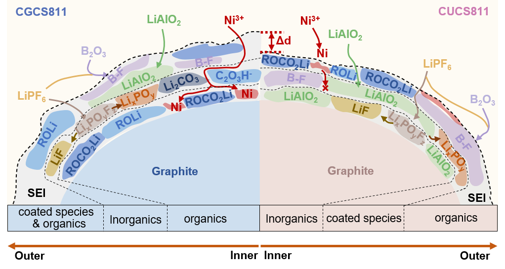 本研究通过多层级分析,明确了均匀结构包覆的NMC811正极上的包覆物(BO-和AlO-)易于向负极表面穿梭,形成BF4-和AlO2-。此外,硼化物和铝化物有助于改变负极表面有机组分与无机组分的排布方式,提高电极的稳定性,并防止了电解质的分解,这为后续构建高稳定的正极包覆方法和结构设计具有理论指导意义。