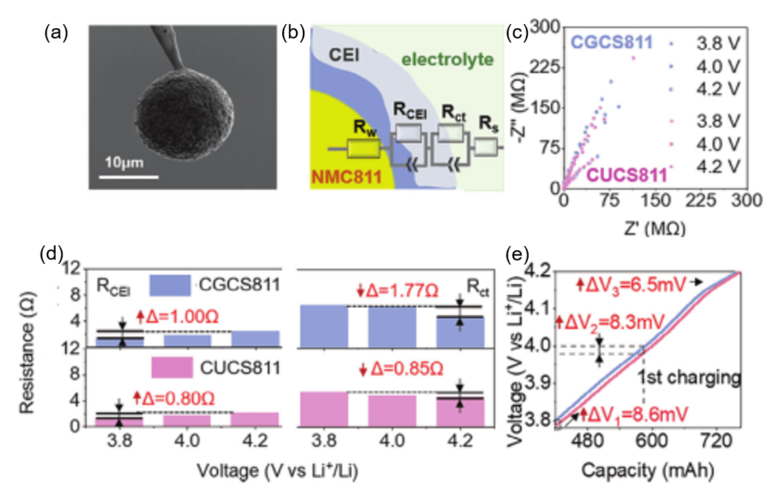 图 2 基于单颗粒EIS评价不同NMC811正极颗粒动力学演化。(a)单颗粒EIS示意图;(b)用于拟合电化学阻抗谱的等效电路图;(c)不同截止电压下EIS数据的Nyquist图;(d)界面阻抗和电荷转移阻抗的衰减量;(e)两体系电池电压偏差。