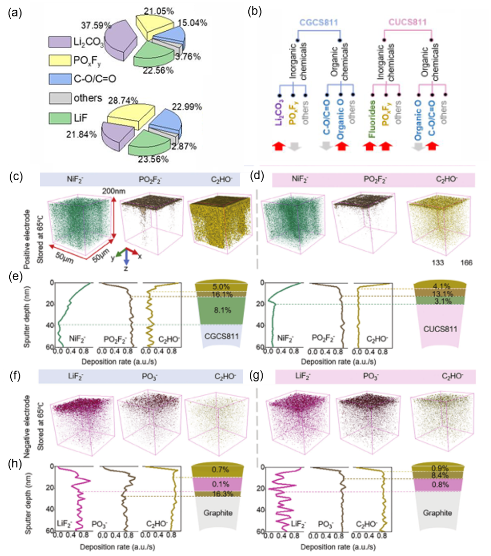 图 5 基于XPS及TOF-SIMs界面稳定性分析。(a)两体系电池中几种显著不同成分的比例;(b)影响界面稳定性的主要物质及其组分变化;(c,d)65℃存储的正极TOF-SIMs三维重构图;(e)NiF2-, PO2F2-, C2HO-在正极侧深度分布;(f,g) 65℃存储的负极TOF-SIMs三维重构图;(h)LiF2-, PO3-, C2HO-在负极侧深度分布。