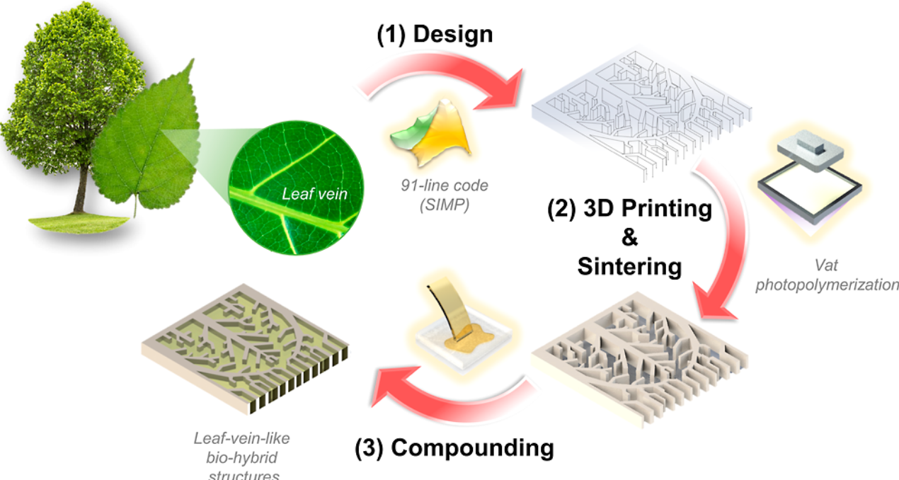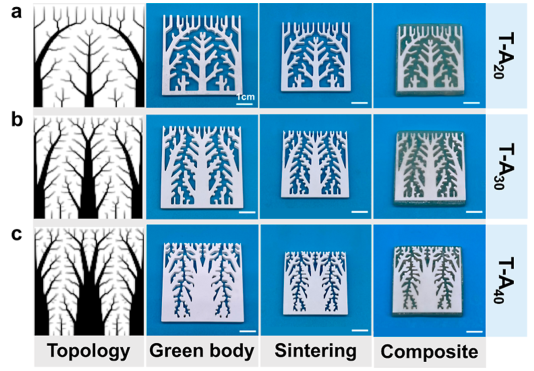 研究团队首先基于“先进结构”思想,通过拓扑优化设计了体积分数为20 vol.%、30 vol.%和40 vol.%的Al2O3陶瓷结构,接着,在光固化3D打印、烧结制造Al2O3结构的基础上,与EP(环氧树脂)复合获得了仿叶脉Al2O3/EP复合结构。