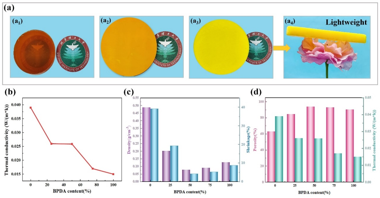 (c)密度和收缩率随BPDA比例的变化情况;(d)孔隙率和导热系数随BPDA比例的变化情况。