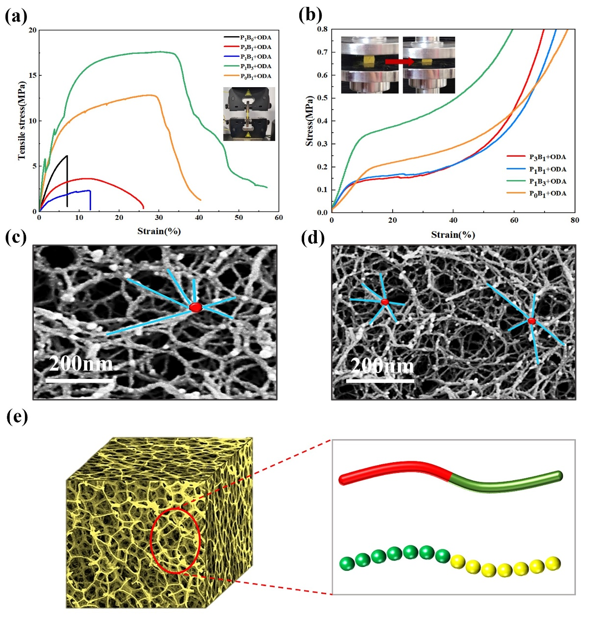 (c)和(d) 为P1B3-PIA和P0B1-PIA中具有高度互连节点的随机三维网络的局部SEM图像;