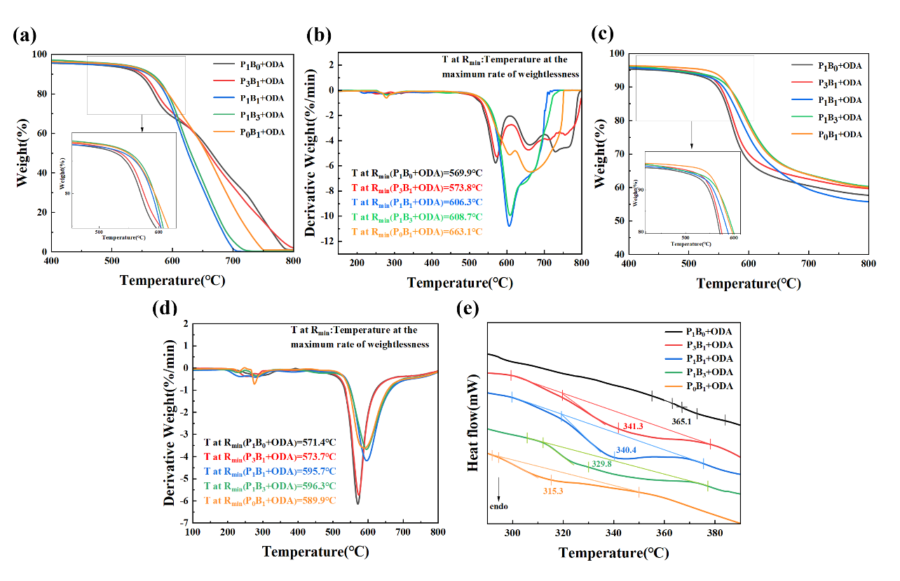 (c) N2中的TGA和(d) DTG曲线;(e)基于DSC的Tg曲线。
