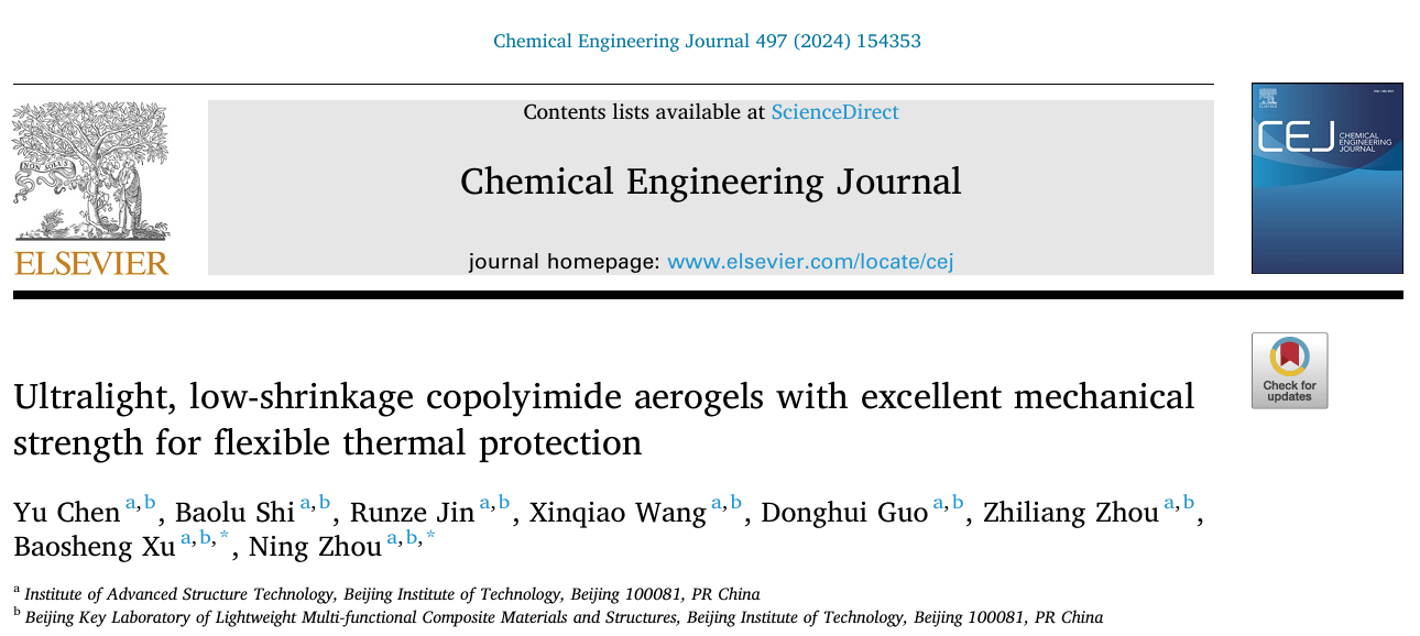 原文链接:Chen, Y., et al., Ultralight, low-shrinkage copolyimide aerogels with excellent mechanical strength for flexible thermal protection. Chemical Engineering Journal, 2024. 497: p. 154353.https://doi.org/10.1016/j.cej.2024.154353