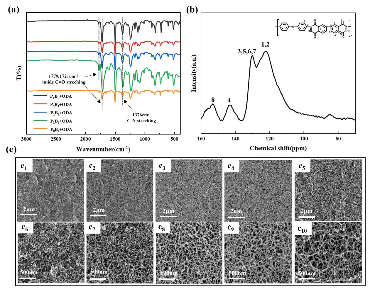 图2.PIA性能表征:(a)不同二酐单体比例PIA的FTIR光谱图;(b) P1B3-PIA的13C NMR谱图;(c) PIA的SEM微观横截面形貌:c1-c5为二酐中BPDA的比例从0%增加到100%时PIAs的微观结构形貌,c6-c10为相应的高倍下PIAs微观形貌。