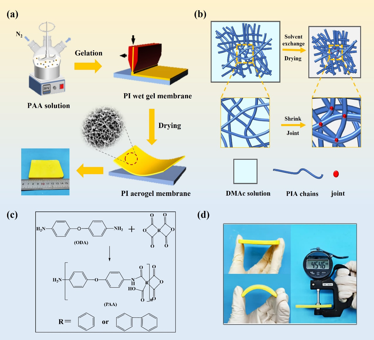 聚酰亚胺气凝胶(PIAs)由于其优异的耐高温性能、广泛的工作温度范围和灵活性,在热防护材料应用方面受到了广泛的关注,目前被认为是高端制造业的关键材料。其良好的柔韧性、优异的热稳定性和高孔隙率等优良特性使其成为航空航天和空间探索设备(如气动减速器、可回收太空舱和地面探测器等)的最佳隔热材料。然而,由于复杂的应用环境和使用要求,平衡传统PIA的耐高温性和机械强度仍是一项挑战。此外,高收缩率和较差的成型能力限制了材料的多功能发展。因此,设计气凝胶的宏观形状和微观结构是实现低收缩率、强保温性和高机械强度的必要条件。