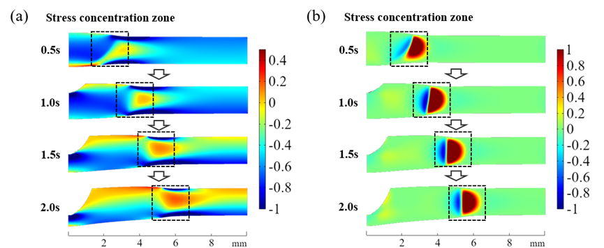 图 4 (a) 不同的时刻 σx/X1 分布;(b) 不同的时刻 σy/X2 分布。
