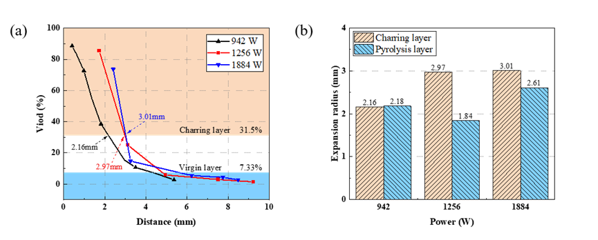 图 3 (a) 径向空隙分布;(b) 不同功率下炭化层和热解层的厚度。