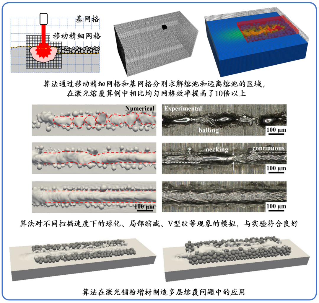 金属增材制造过程的高效高保真局部多网格有限体积法金属增材制造在航天、航海、国防等领域有着广泛的应用,其加工过程的数值模拟算法涉及到复杂的多尺度、多物理耦合求解,是计算力学领域中的热点和难点问题。以激光选区熔化技术为例,描述部件和熔池流体所需的空间离散尺度通常横跨三个量级以上,计算资源需求巨大,使得高保真模拟算法难以完成大规模问题的求解。 金属增材制造的局部多网格有限体积法 近期,我院廉艳平教授课题组针对金属增材制造过程中的“热-流”耦合问题,提出了一种新的高效、高保真数值模拟算法:局部多网格有限体积法(local multi-mesh finite volume method)。该算法基于叠加细化的思想,采用一套移动精细网格跟踪热源,并对熔池内的流动、传热、相变过程进行精细求解,同时采用一套基网格对远离熔池的大尺寸区域进行温度场求解,在两套网格之间建立了高效的温度Dirichlet耦合方法。研究者建立了两套网格中离散元方法与有限体积法的体积分数转化技术,以及高稳定性的热源施加方案。算法通过一系列算例测试,包括激光扫描基板、激光单层、多层铺粉熔覆问题等,与解析解、实验结果符合良好,证明算法具有高精度;计算效率测试结果表明,...2023.03.31 -