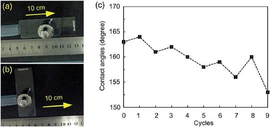 耐刮擦透明超疏水材料研制新进展先进结构技术研究院陈明继副研究员与华北电力大学课题组合作,在耐刮擦透明超疏水材料研制方面取得进展,相关成果于2016年5月发表在材料化学主流期刊Journal of Materials Chemistry A (第4卷,7869-7874页)。 透明超疏水涂层不仅具有优异的超疏水特性,而且具有很好的透光性,在汽车挡风玻璃、太阳能帆板等方面有广泛的应用前景。目前的透明超疏水涂层功能稳定性不佳,在表面磨损和油污沾染后超疏水性和透光性损失严重。 图1 砂纸反复刮擦后水滴表面接触角的变化情况 图2 酸碱侵蚀后材料透明超疏水特性的效果 本研究通过巧妙的设计和工艺改进,将接枝有含氟低表面能官能团的二氧化硅纳米颗粒嵌入到硅橡胶基体的表面和浅表层中,同时提高了透明超疏水材料的耐酸碱腐蚀和耐刮擦性能。研究组将进一步改进完善该类材料的整体性能,以期能够应用于恶劣野外环境下的透明超疏水防护表面。2016.05.03 -