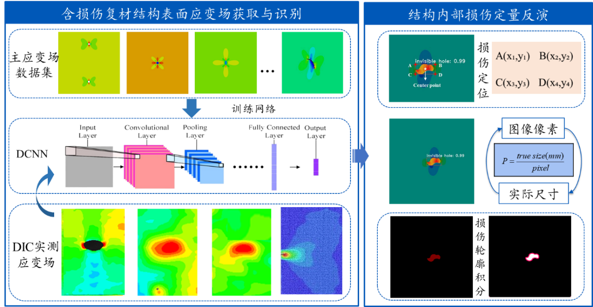 将Lamb波导波检测与结构表面应变场反演方法相结合,借助计算机深度学习技术,研发了结构表面应变场数据与Lamb波特征值相结合的损伤识别与结构实时性能反演网络模型,获取了典型荷载作用下不同类型损伤对复合材料结构外部应变场与Lamb波特征值的影响规律,实现了复材结构内部损伤类型、位置与几何尺寸的高精度预测。
