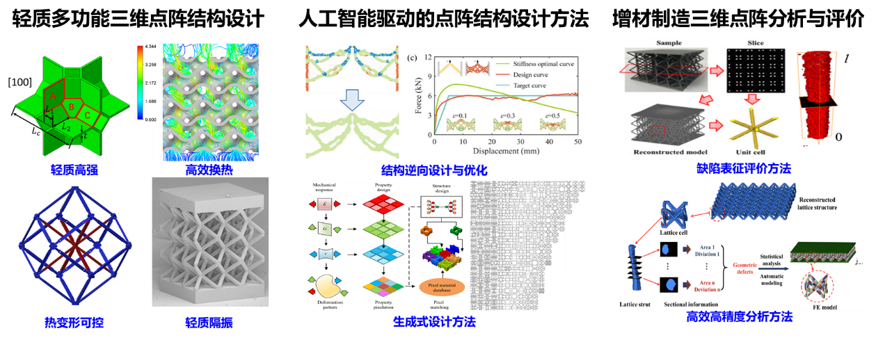 轻量化多功能材料与结构轻量化多功能材料与结构的设计与应用,是提升国防装备结构效能的重要途径之一,已成为科学界和工程界共同关注的热点问题。本方向致力于发展:①超轻质三维点阵结构、②宽频吸波电磁隐身结构、③空间装备高精高稳结构、④大尺寸异型复合材料结构、⑤极端环境与多尺度结构、⑥智能仿生机器人的创新设计方法、高性能制造技术和高效高精度分析评价技术,融合了力学、机械/车辆工程、航天工程、机器人工程等学科领域的前沿知识,旨在通过材料-结构-功能-制造的全链条、多维度创新,推动国防装备先进结构技术的发展。前期承担了重点研发计划、基础加强计划、重大工程专项等项目,成果在卫星、空间站、运载火箭等装备中得到应用,与航天五院、航天一院、航天八院等单位建立了广泛的合作关系。 细分方向1:超轻质三维点阵结构设计与制造 针对航空航天、国防工业等领域对超轻质与功能融合结构的迫切需求,研究轻质多功能三维点阵结构的创新构造方法与变形调控机理,发展多场耦合下点阵结构的本构模型与变形预测理论,建立增材制造三维点阵结构的表征评价方法与高效高精度力学性能分析方法,探索人工智能驱动的点阵结构生成式设计方法,开发增材制造点阵结构一体化设计软件平...2025.02.10 -