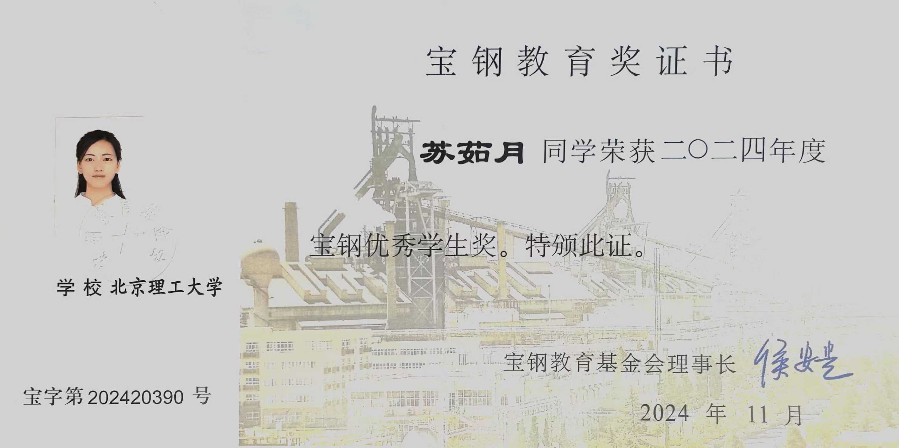 喜讯│我院博士生获宝钢优秀学生奖!全校仅5人!近日,宝钢教育基金会2024年度宝钢教育奖评审结果揭晓。我校9名师生获奖,其中我院博士生苏茹月获宝钢优秀学生奖。 宝钢教育奖是全国最具知名度的教育奖项之一。2024年全国共283位教师、500位学生获宝钢教育奖,我校共有5位学生获奖。 苏茹月,导师为青年教师何汝杰教授,是先进结构技术研究院2021级博士研究生。研究方向为功能陶瓷材料及器件3D打印。博士期间,以第一作者在顶级期刊上发表高水平SCI论文4篇,其中1篇被ESI高被引收录,1篇入选热点论文,累计影响因子55.6;以学生第一作者申请发明专利1项,参与申请专利3项;参与国际学术会议,并作口头报告;参与多项国家级科研项目及北理工研究生水平和创新能力提升专项计划重点项目。2024.11.23 -