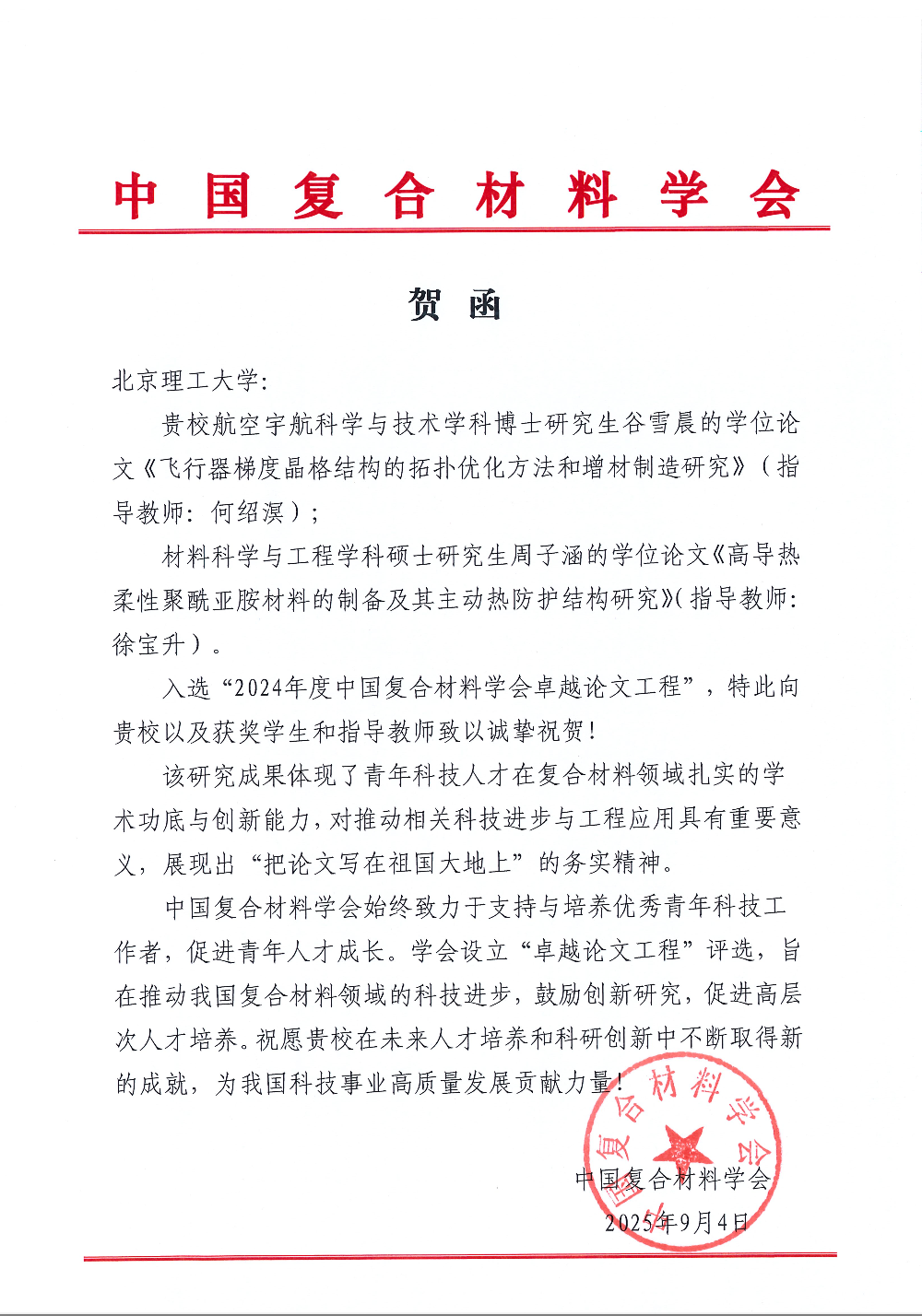 祝贺! 我院硕士毕业生学位论文入选中国复合材料学会卓越论文工程2025年8月26日,2024年度中国复合材料学会卓越论文工程完成评选工作,我院毕业生周子涵的硕士学位论文《高导热柔性聚酰亚胺材料的制备及其主动热防护结构研究》入选“2024年度中国复合材料学会卓越论...2025.09.29 -