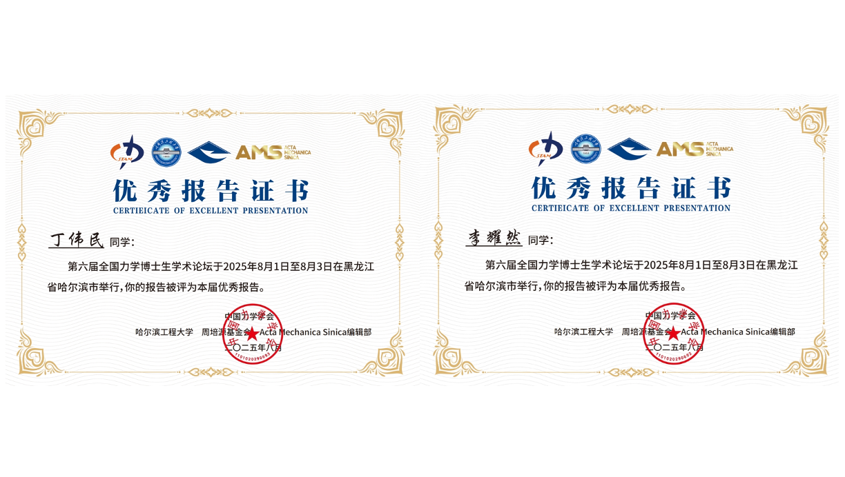 祝贺!我院博士研究生荣获第六届全国力学博士生学术论坛优秀报告奖8月1日- 3日,第六届全国力学博士生学术论坛在黑龙江哈尔滨顺利召开。此次论坛由中国力学学会主办,哈尔滨工程大学承办,周培源基金会、《Acta Mechanica Sinica》编辑部协办。论坛设有8个并行分会场,安排了6场特邀报告和342场分学术报告,吸引来自全国60余所高校和科研院所的510余名力学及相关领域的专家学者和博士生参会。我院力学专业2022级博士生丁伟民、2023级博士生李耀然分别在“固体力学”、“冲击力学”分会场做专题报告,被评选为第六届全国力学博士生学术论坛优秀学术报告。 丁伟民进行题为“剪折纸电磁吸波结构可重构设计与功能调控方法”的报告。报告围绕剪折纸结构,提出了可重构电磁吸波结构的设计方法与功能调控策略,揭示了剪折纸结构协同变形机理,实现了可调控和宽频隐身特性。 李耀然进行题为“高能激光毁伤CFRP热-力-化耦合模型和毁伤形貌的三维表征研究”的报告。报告围绕高能激光毁伤CFRPs关键问题,建立了毁伤形貌三维定量化表征方法与高能激光毁伤CFRPs的理论预测模型,揭示了激光作用下CFRPs的多物理场耦合毁伤机理,实现了毁伤行为的高精度预测与评估。 学生情况...2025.09.12 -