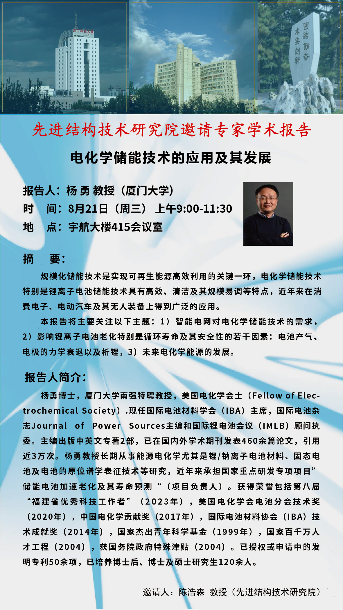 厦门大学杨勇教授作题为“电化学储能技术的应用及其发展”的学术报告预告