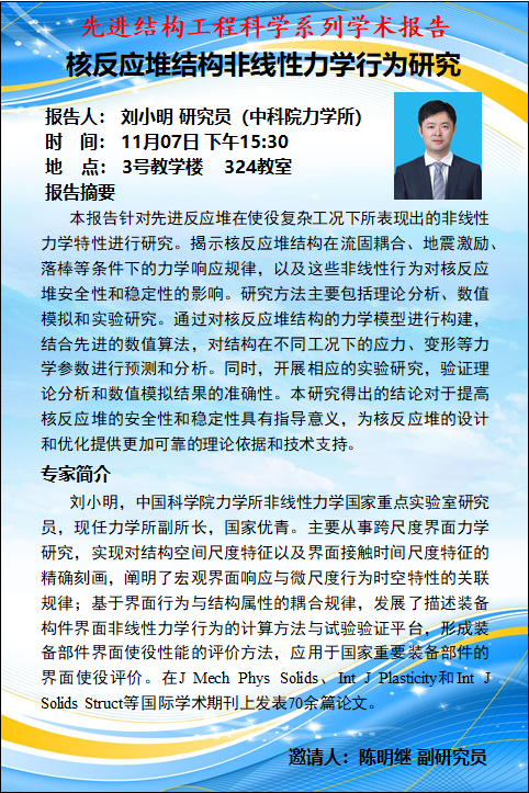 中科院力学所刘小明研究员作题为“核反应堆结构非线性力学行为研究”的学术报告预告