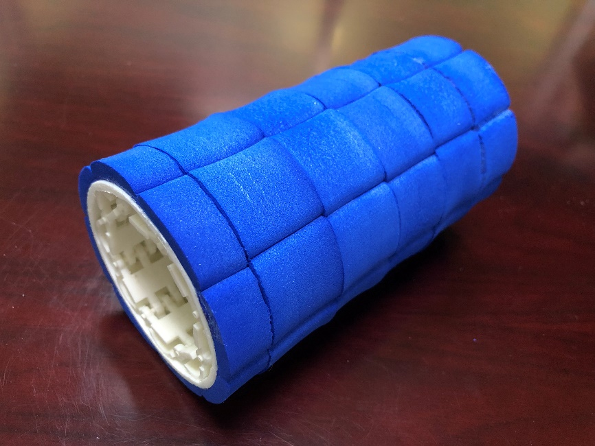 在先进结构概念的启发下,北理工力学科研团队近期提出了一种可产生内部形变的泡沫轴产品原型。该结构别出心裁的采用硬质薄壳层包裹内部可变形力学超结构单元环形阵列,在保持近似外部刚性约束条件下,提供一种能量传递通路,从而能够与骨骼、筋膜等硬质结构产生相互作用,提供重量训练后快速恢复、提升运动机能的功能。